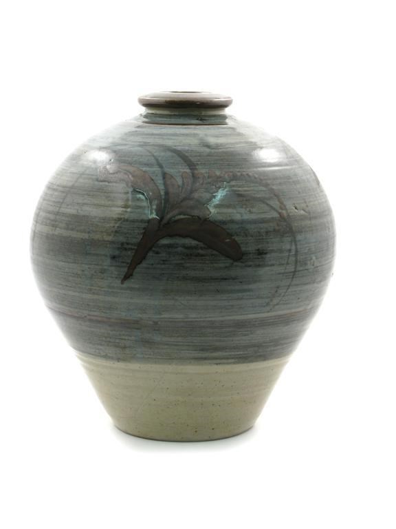 a large Lowerdown Potttery stoneware vase, shouldered form with collar rim, painted with simple foxglove spray in tenmoku and iron red, on pale blue ground impressed seal marks33cm. high