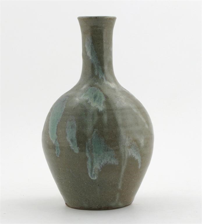 a Leach Pottery stoneware bottle vase, ash glaze to the foot splashed with blue and lavender impressed seal marks 27cm. high