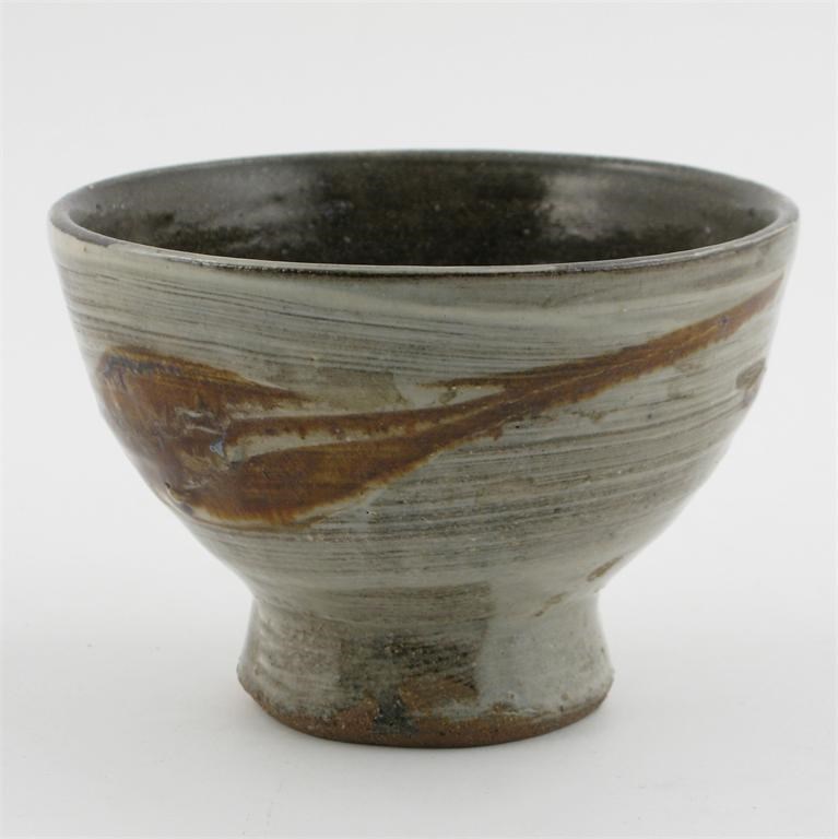 a Leach Pottery stoneware footed bowl, with Hakeme glaze impressed seal marks 14.5cm. diam.