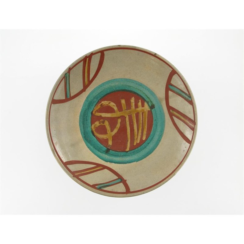 a stoneware charger, painted in copper red and emerald green on a celadon ground unsigned 27cm. diam.