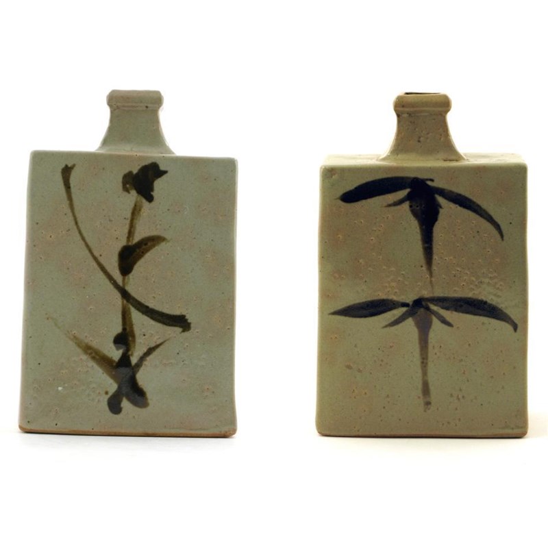 a slab built bottle vase, painted to both sides with simple bamboo stem unsigned 20cm. high