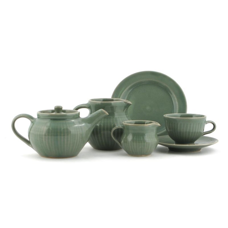 A Crowan Pottery porcelain tea service, with fluted decoration covered in a celadon glaze, comprising; teapot and cover, milk-jug and sugar basin, four cups, twelve saucers, eight side plates, a larger jug and and a matched jug and a collection of domestic ware impressed seal mark, minor damages, teapot 9.5cm. high