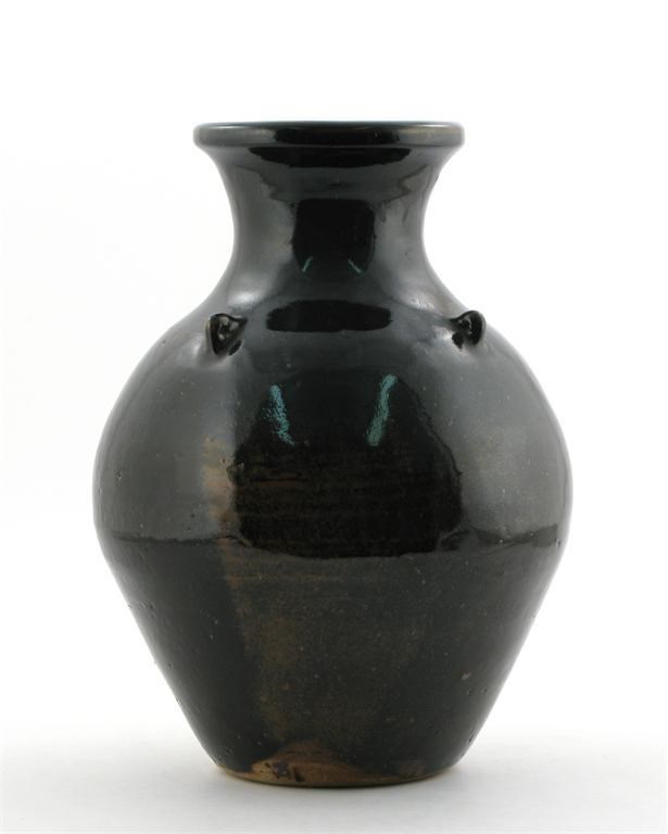 A large stoneware vase with four applied loop handles, covered to the foot with a tenmoku glaze impressed seal mark, painted Leach Pottery mark 33cm. high