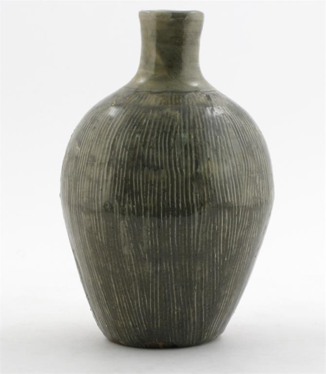 a stoneware bottle vase, with combed decoration, glazed to the foot in celadon impressed seal marks 23cm. high