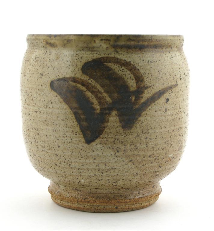 a stoneware footed vase, painted with simple brush stroke foliate design in tenmoku over mottled ground incised mark 18cm. high