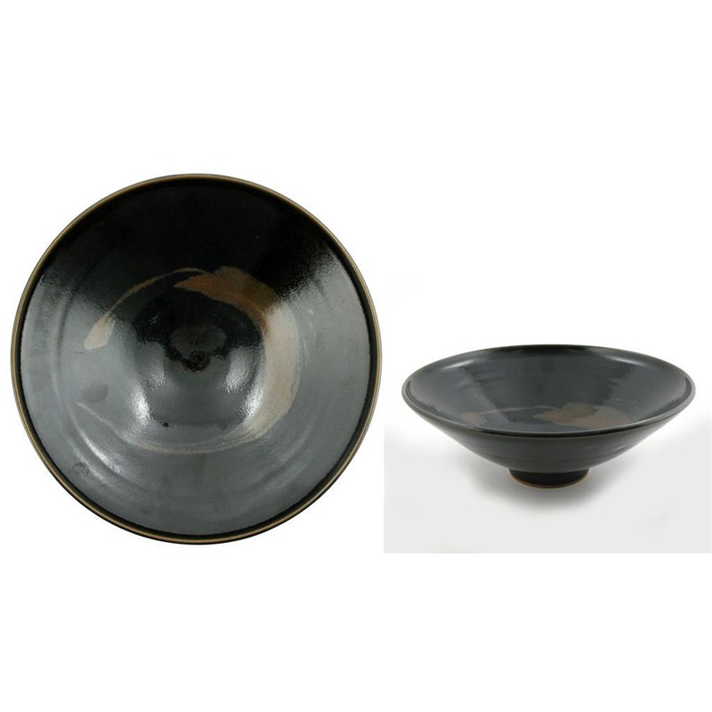 a stoneware bowl, glazed with tenmoku brush design to the well impressed seal mark 29cm. diam.