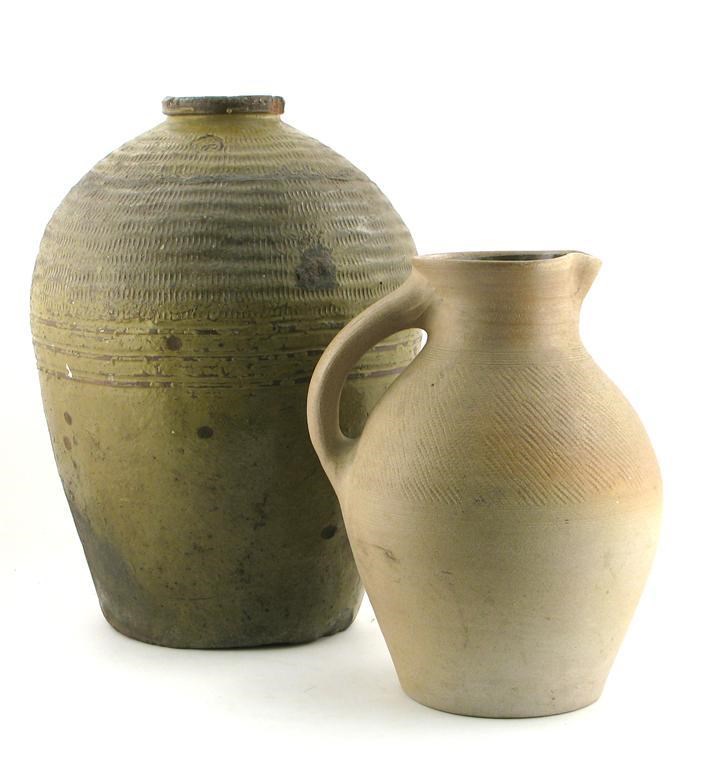 a tall stoneware bellied jug with light surface decoration and pale ash glaze, and a large shouldered vase unsigned 38cm. high