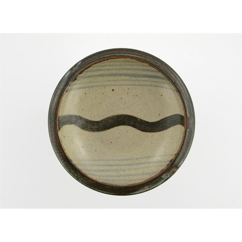 a stoneware plate painted in tenmoku, rust and blue with a willow tree, on oatmeal impressed seal mark, 16.5cm. diam.