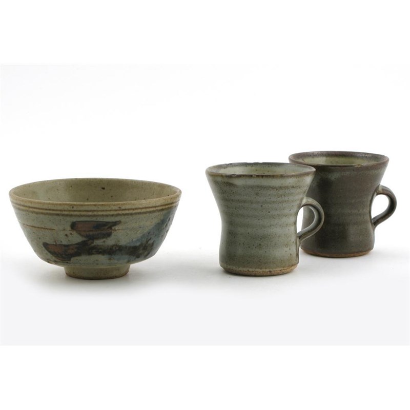 a stoneware bowl, painted with simple brush motif in tenmoku and rust over oatmeal, two waisted mugs, and a large bowl painted impressed seal marks, chips to mugs bowl 13.5cm. diam.