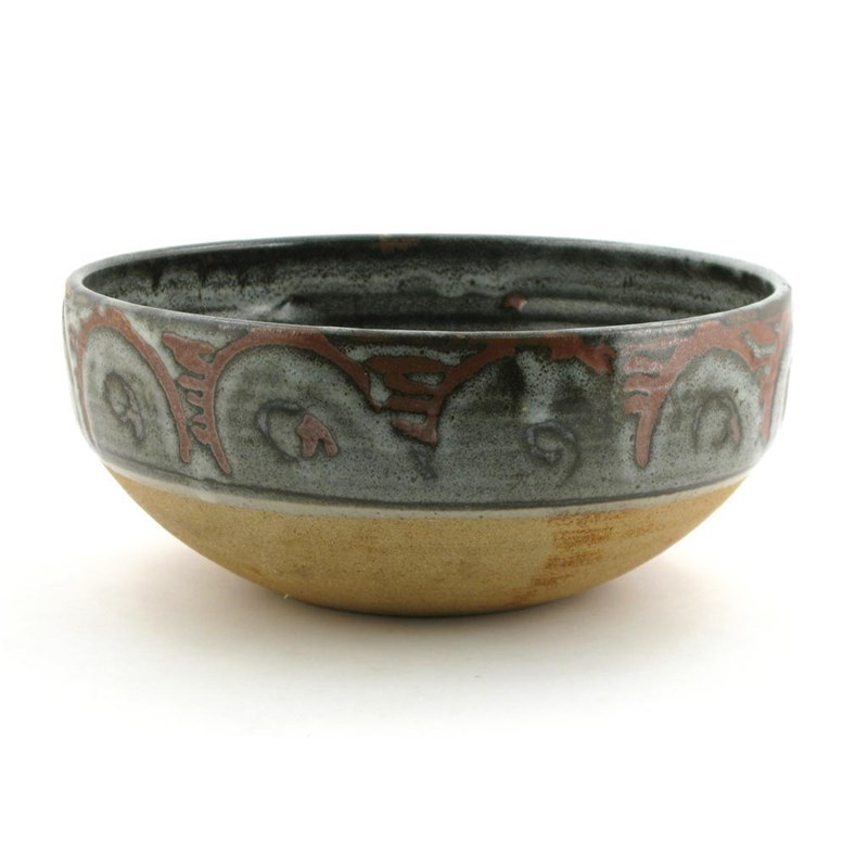 a large earthenware bowl, decorated to the exterior with tenmoku brush stroke design, over ash impressed seal mark 31cm. diam.