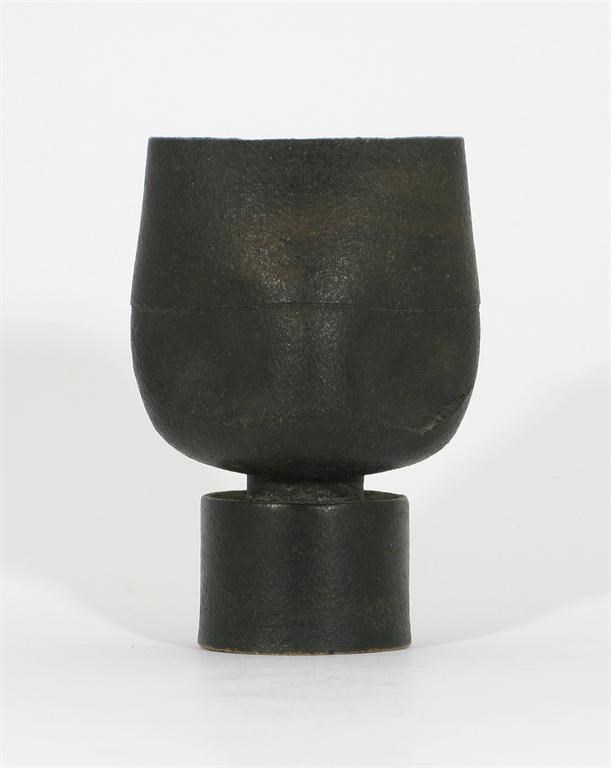 a small cup form on drum base, each side with pressed dimples, glazed black manganese impressed seal mark 11cm. high