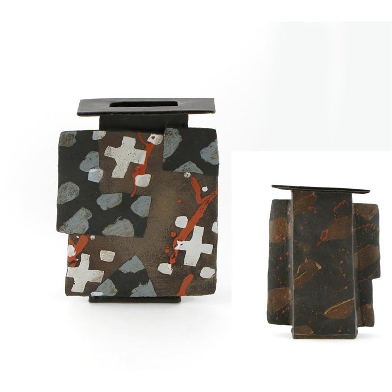 a large and impressive slab built stoneware vase, painted with geometric panels in slip, the reverse with red slip splashes painted Maltby to base 36.5cm. high