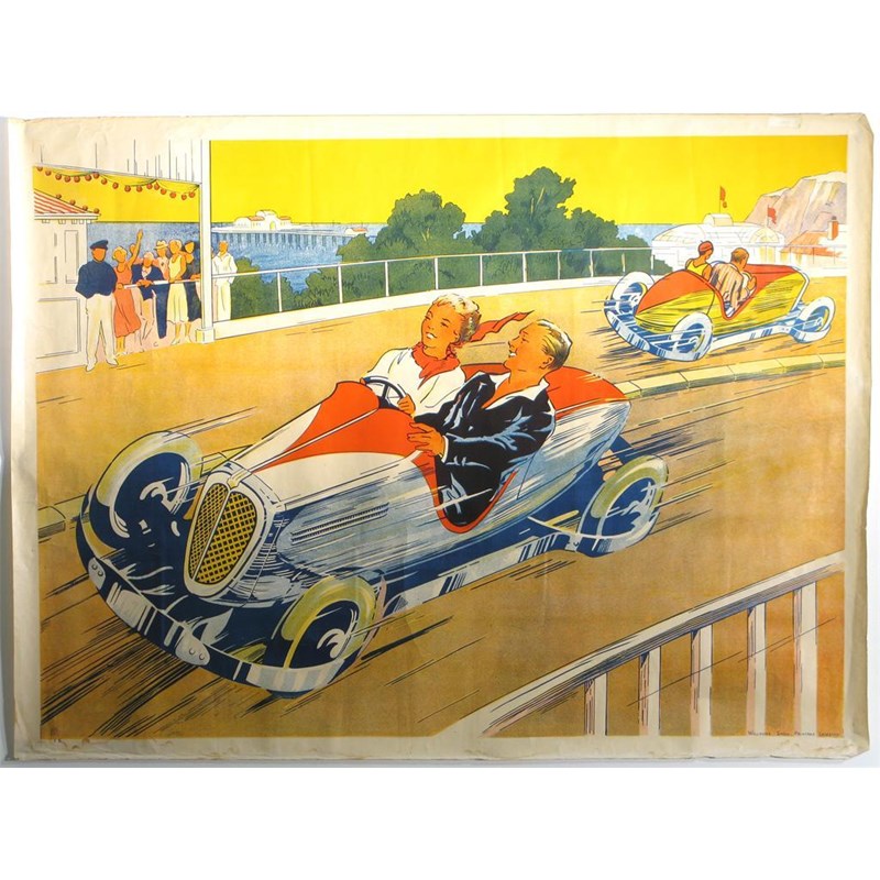 A lithographic poster of a young couple driving in a vintage open topped car printed by Willsons Show Printers, Leicester, and another of people at the fairground losses 101 x 76cm.