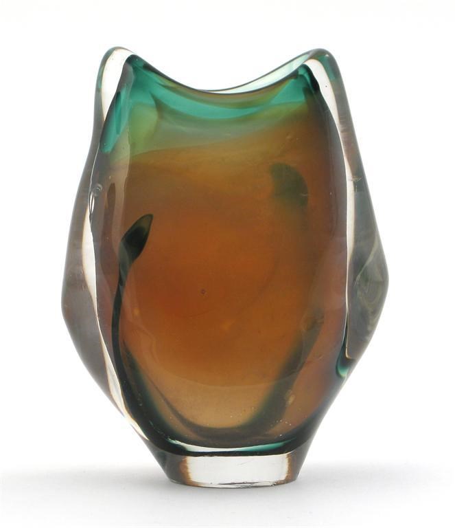 A Leerdam Unica glass vase designed by Floris Meydam, model AM2059, green and opaque pink glass with pulled rim, etched marks, date mark for 1956 14.5cm. high