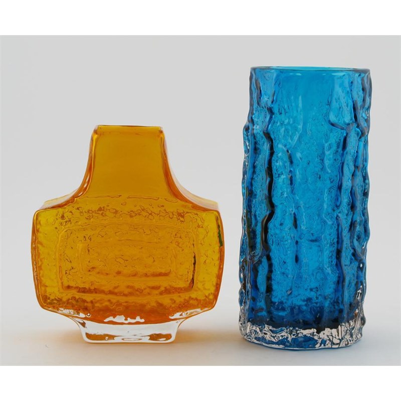 A Whitefriars Glass Tangerine glass vase designed by Geoffrey Baxter, moulded in low relief, rectangular form, a Whitefriars Kingfisher Blue bark vase and an aubergine glass plate unsigned tangerine vase 18.5cm. high