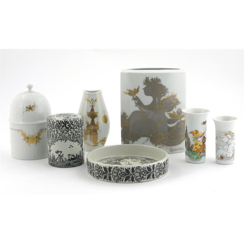 A Rosenthal Pottery vase designed by Bjorn Wiinblad, printed in grey and highlighted in gilt with figures holding birds, two spill vases, a covered pot and three other items printed marks, facsimile signature 17cm. high