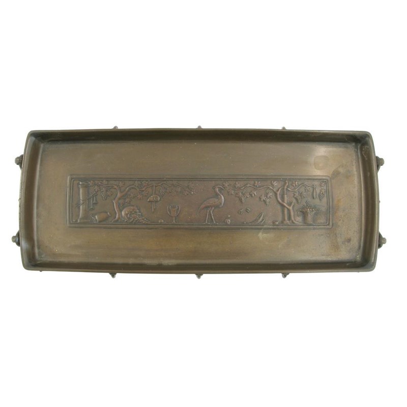 A Ferdinand Barbedienne bronze tray rectangular, twin-handled form, cast in relief with ram's head motif, the central well with a classical panel signed F Barbedienne in the casting 46cm. wide