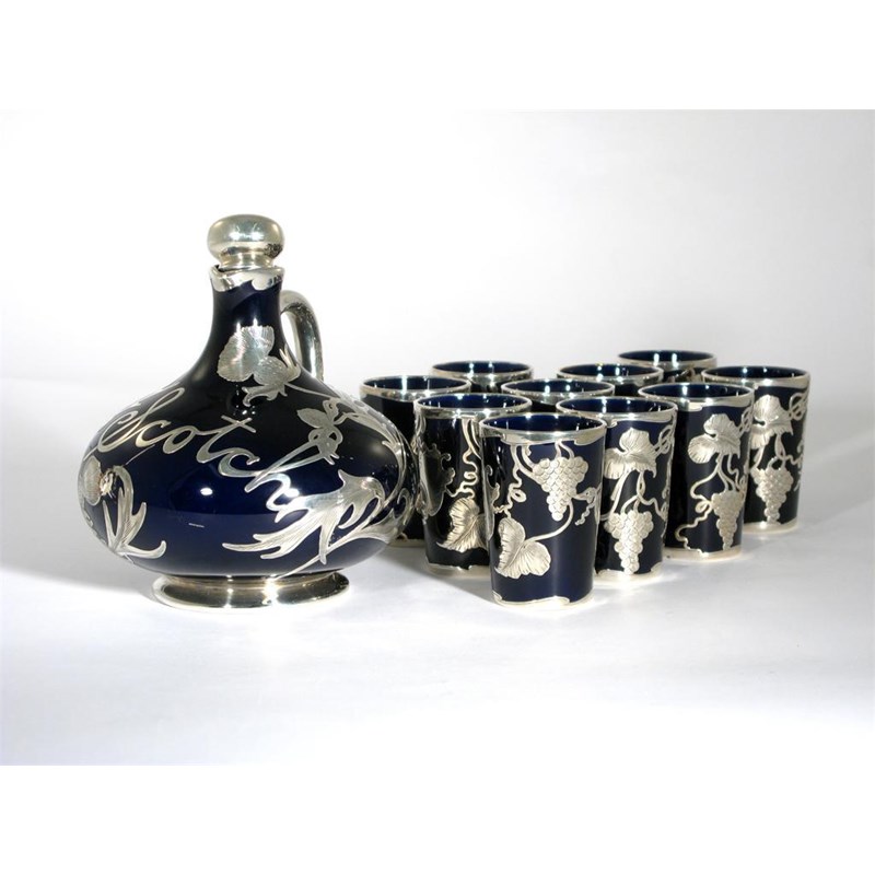 A Lenox white metal mounted porcelain decanter and ten tumblers the decanter inscribed 'Scotch', the white metal overlay forming thistle sprays, printed marks, metal stamped Sterling, cruise to body of decanter, 17cm. high