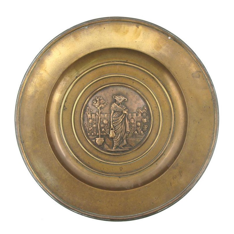 An Aesthetic Movement bronze charger the well cast in low relief with a woman watering flowers, in the manner of Walter Crane unmarked 44cm. diam.