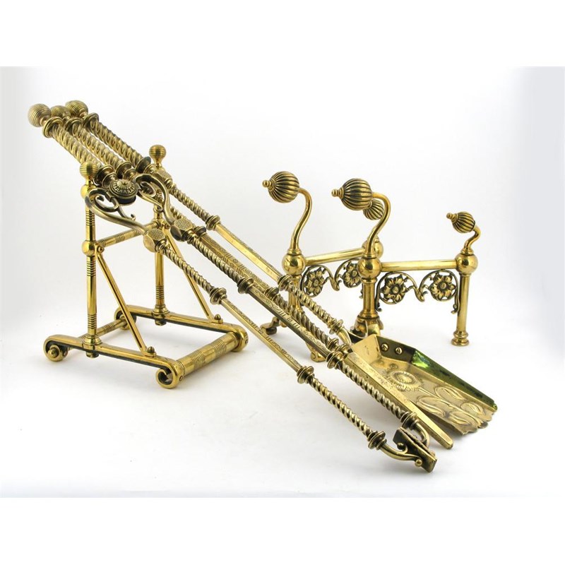 A set of Benham & Froud fire tools, stamped and pierced Aesthetic sunflower decoration, comprising, tongs, poker and shovel and two pairs of andirons stamped marks to tools 76cm. long