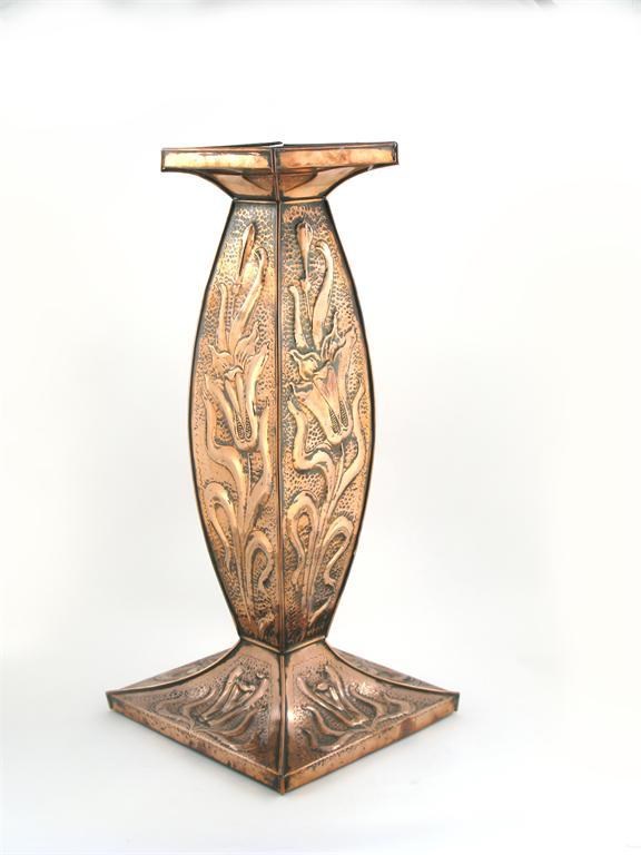 An Arts and Crafts copper jardiniere stand stamped with foliate design unsigned 76cm. high