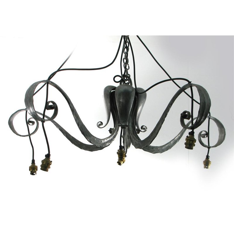 A large aluminium ceiling light, central flower form, with scrolling arms and etched glass shades unsigned 85cm. wide