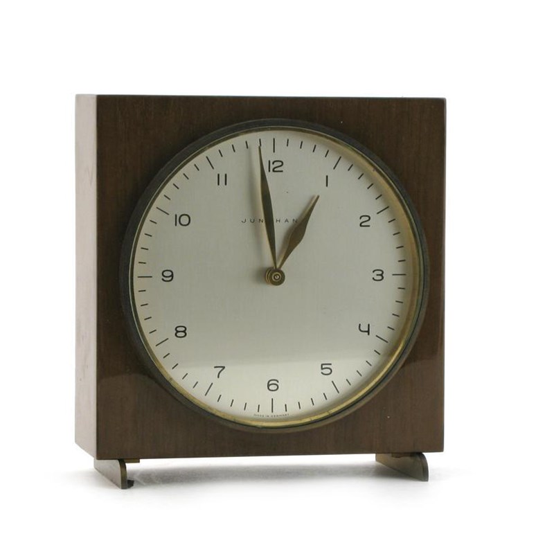 A Junghans mantle clock designed by Max Bill, rosewood veneer case on brass feet signed to dial 18cm. high