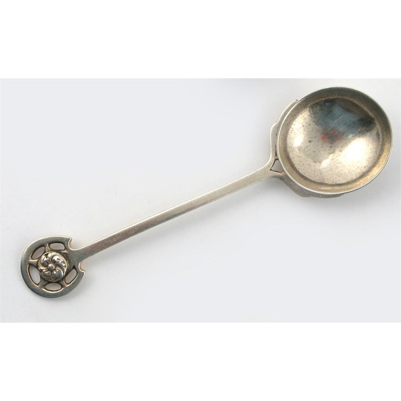 An A E Jones silver spoon with hammered bowl, the pierced finial with floral roundel stamped marks, Birmingham 1929 13cm. long