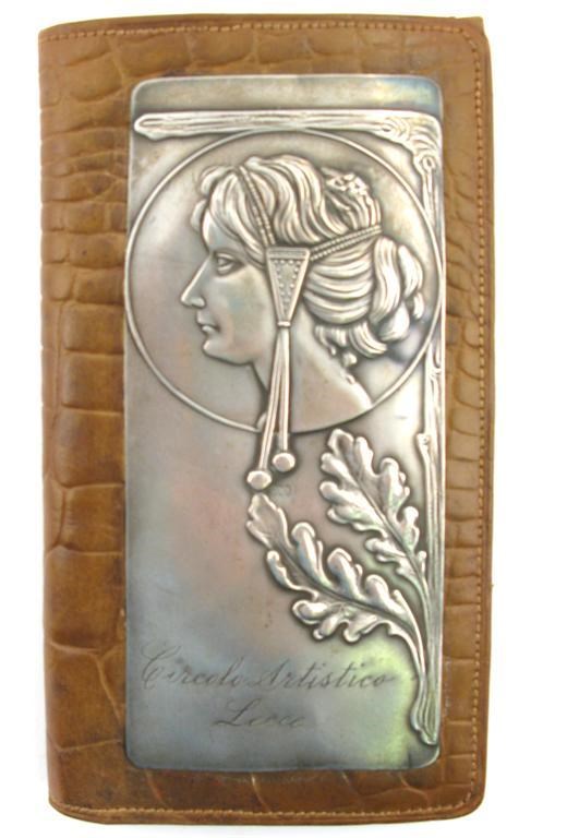 An Art Nouveau Italian silver mounted leather purse set with rectangular panel of a maiden profile portrait stamped 800 14.5cm. high