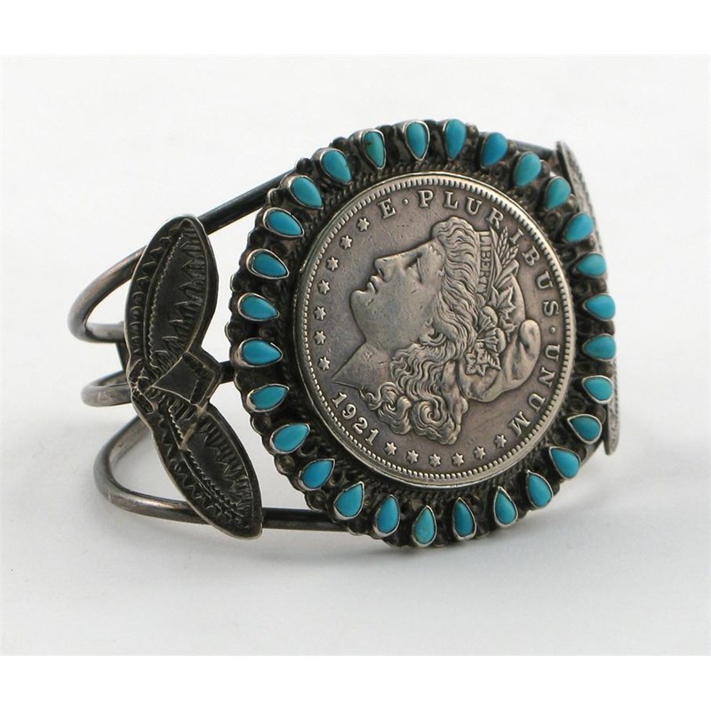 A Navajo indian bracelet, wirework form with foliate panels, set with turquoise enamel stones, with 1921 coin inset 7cm. wide