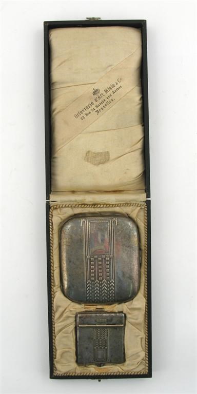 A continental white metal cigarette case and vesta case, stamped in relief with geometric foliate panel, in fitted case, stamped marks, the case for Orfevrerie d'Art Miele & Co case 9cm. high
