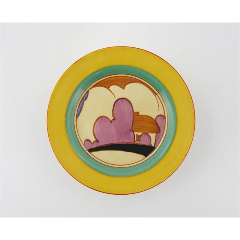 'Autumn' a Clarice Cliff Fantasque Bizarre side plate, painted in colours inside yellow and green bands printed factory mark 17.5cm. diam.