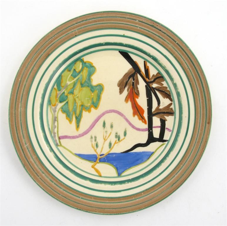 'Coastal Oak' a Clarice Cliff Bizarre side plate painted in colours printed factory marks, light wear 17.5cm. diam.