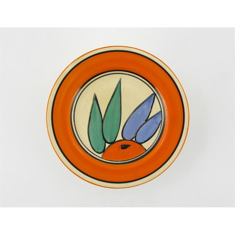'Oranges' a Clarice Cliff Bizarre side plate painted in colours inside orange band printed factory mark 15cm. diam.