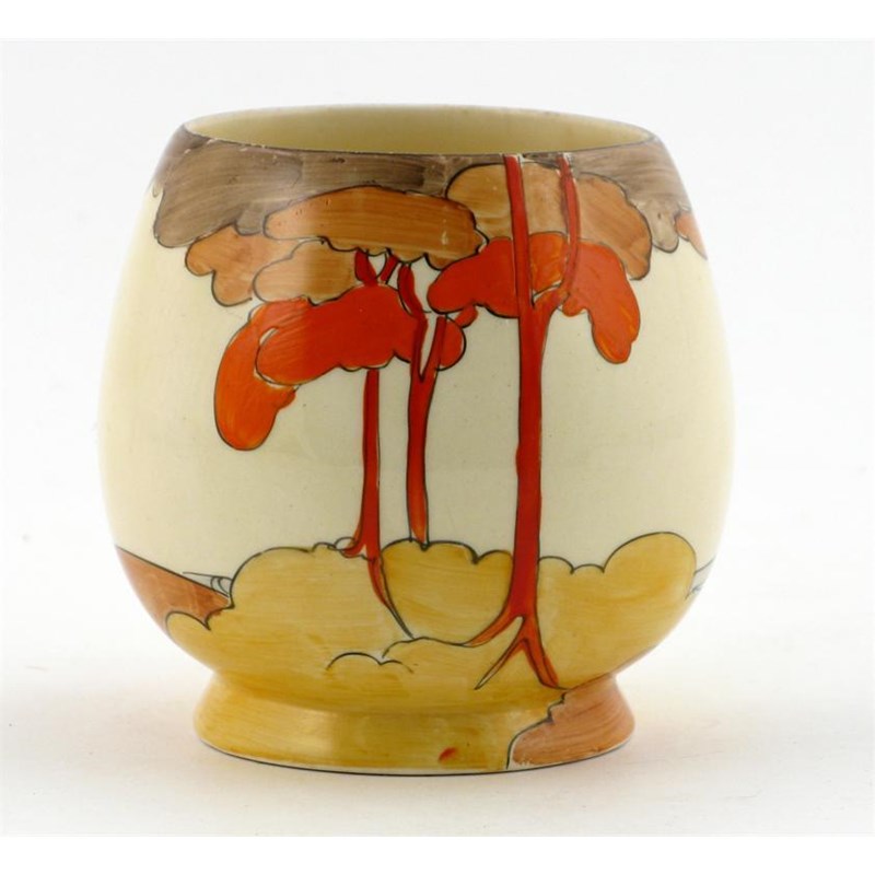 'Coral Firs' a Clarice Cliff Bizarre pot painted in colours printed factory marks 8.5cm. high