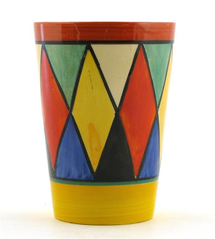 'Original Bizarre' a Clarice Cliff Bizarre large beaker, painted with a broad band of yellow and red diamonds flanked by blue, black and green triangles, between yellow and red bands printed factory mark, yellow band overpainted, 12cm. high