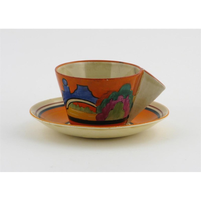 'Applique Avignon' a Clarice Cliff Fantasque Bizarre Conical cup and saucer, painted in colours, the saucer banded orange and black printed marks, hairline to body7cm. high