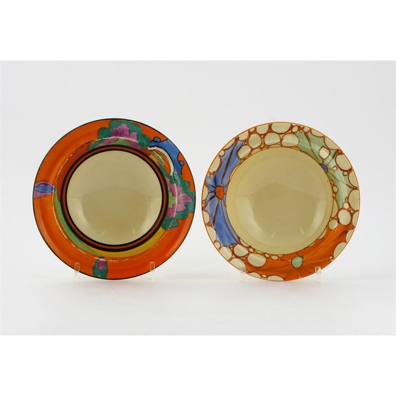 'Applique Avignon' and 'Broth' two Clarice Cliff Bizarre breakfast bowls painted in colours printed factory marks, restored rim to Avignon, 16cm. diam.
