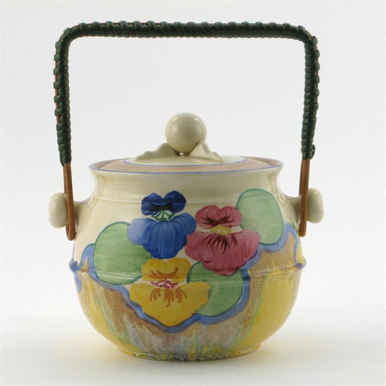 'Nasturtium' a Clarice Cliff Bizarre 333 biscuit barrel and cover, painted in colours printed factory marks, small chip to inner rim of cover 16cm. high