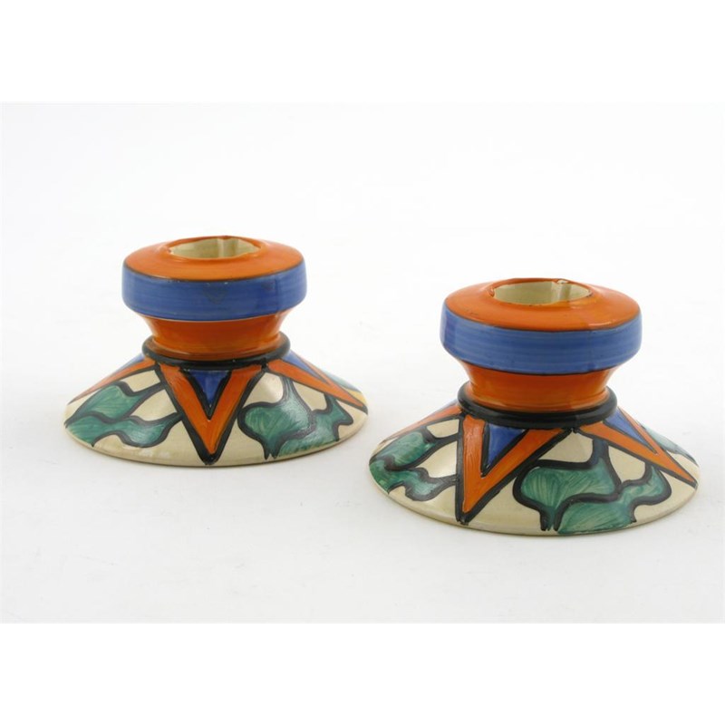 'Double V' a pair of Clarice Cliff Bizarre 331 candlesticks,  painted in colours printed factory marks 9cm. diam.