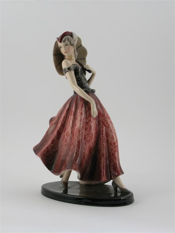 A Goldscheider Pottery figure of a woman strolling with a parasol model no.8138, designed by Claire Weiss, painted in colours impressed and printed marks, hairline to base rim 32cm. high