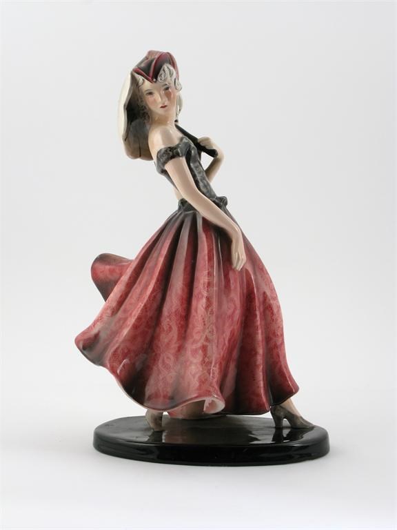 A Goldscheider Pottery figure of a woman strolling with a parasol model no.8138, designed by Claire Weiss, painted in colours impressed and printed marks,  32cm. high