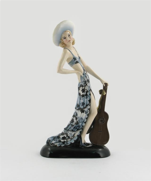 A Goldscheider Pottery figure of a woman with a guitar, model no.6901, designed by Stephan Dakon, modelled wearing slit dress and broad rimmed hat printed and impressed marks 42cm. high