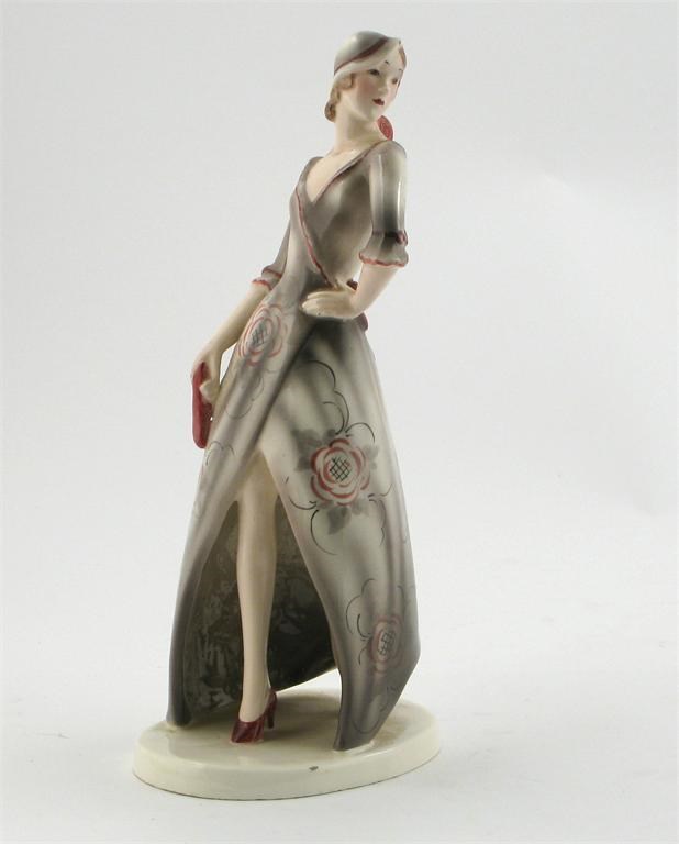 A Goldscheider Pottery model of a woman holding a fan model no.6447, designed by Claire Weiss, painted in colours impressed and printed marks, facsimile signature, small chip to hat 26cm. high