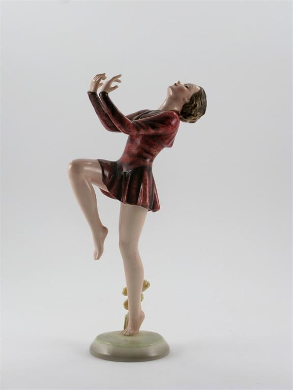 A Goldscheider Pottery model of a girl, model no.8711, modelled balancing on one leg, bringing her hands up to her chest impressed and printed marks, hands restored 38cm. high