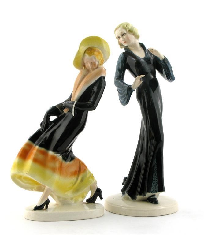 A continental pottery figure of a woman, modelled walking in fur lined coat and broad rimmed hat, and another continental figure of a woman in evening gown impressed number 29cm. high