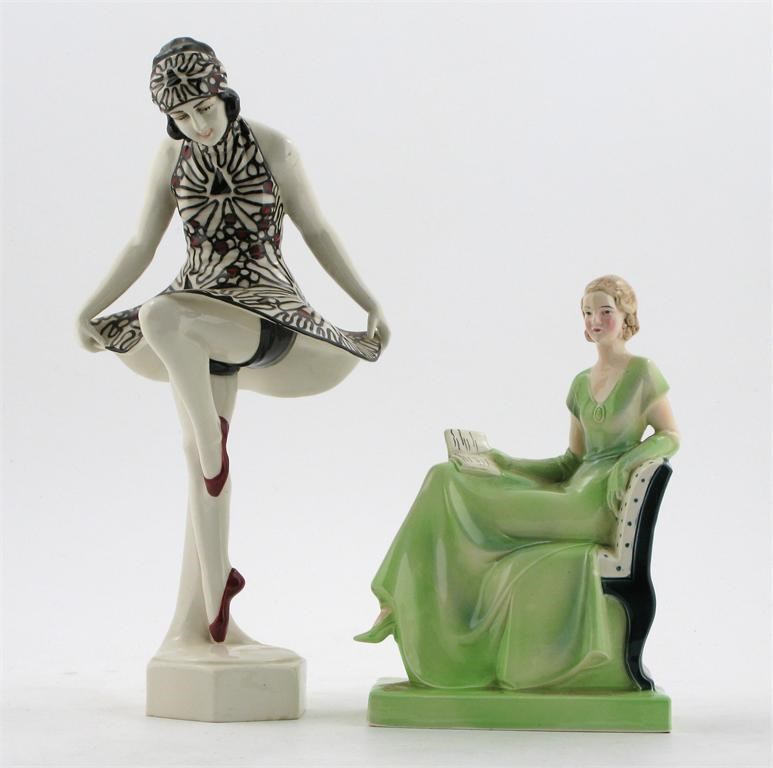 A Katshutte Pottery figure of a girl seated reading a book, glazed in colours, and a continental pottery figure of a dancer modelled on one foot, wearing short patterned dress printed and impressed marks Katshutte 20cm. high