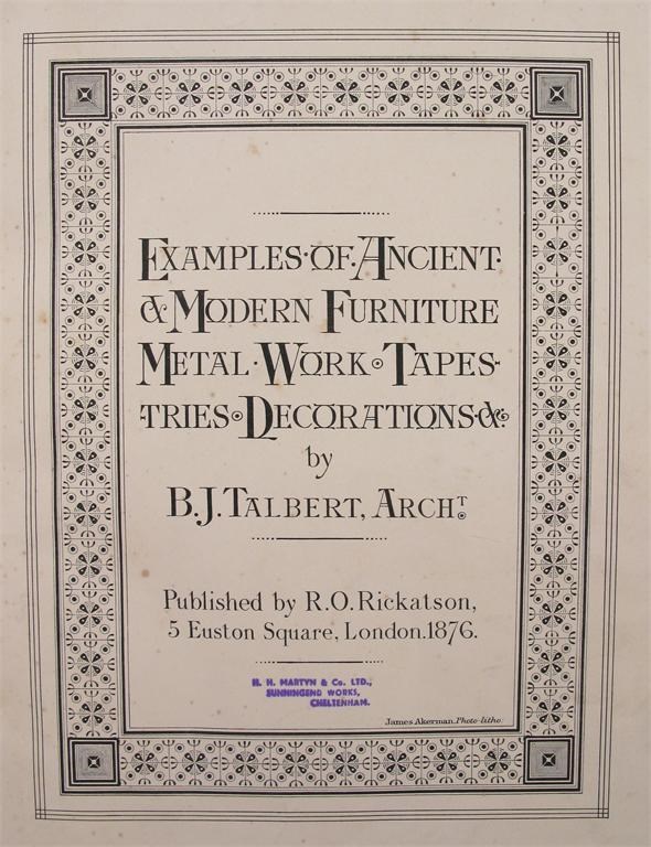 'Examples of Ancient & Modern Furniture Metal Work Tapestries Decorations by B J Talbert, Architect' also known as Gothic Forms, a book published by R O Rickatson, 1878