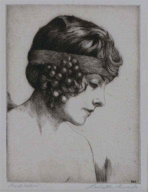 'Meditation' an etching by B M Satterthwaite, framed signed and titled in pencil, initials in the print, image 15 x 11cm.