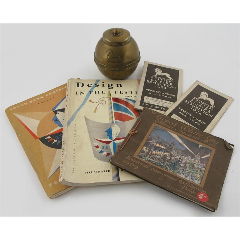 'British Empire Exhibition 1924' a brass vase and cover two exhibition pamphlets, a 1909 Imperial International exhibition catalogue and two 1951 Festival of Britain catalogues